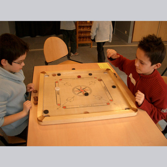 | Description | Faîtes tomber les pions de votre couleur dans les trous situés aux quatre coins du plateau en les percutant avec un gros palet. |